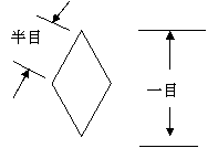 網目の大きさを表します。一目と半目の標記がありますが、当店の標記は半目標記をしております。これは、網目を正方形に広げた場合の一辺の長さを表します。一目標記の場合は、真っ直ぐに引っ張った一目の大きさとなりますので、半目×2となります。